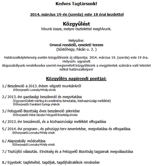2014. március 19-én tartottuk éves rendes közgyűlésünket, mely egyesületünk tisztújító közgyűlése is volt egyben.