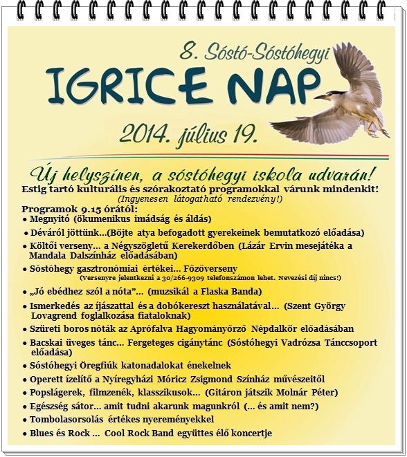 2014. július 19-én nyolcadik alkalommal tartottuk az Igrice Napot. Ebben az esztendőben rendhagyó módon, a Sóstóhegyi Ligetben megszokott helyszín helyett a helyi iskola árnyat adó nagy fákkal körülvett füves udvarán rendezkedtünk be.