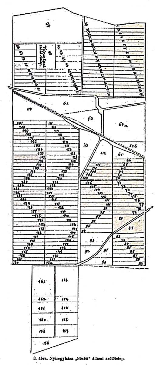 “Itt megtekintettük az állam kezelése alatt álló homokszőlőtelepítvényt, melynek czélja az, hogy Tokaj-Hegyalja tönkrement szegény szőlőbirtokosainak keresetforrást nyisson. A szőlőtelepítés Kosinsky Viktor igazgató vezetése mellett indult meg a Nyíregyházához közel fekvő Pazony község határához tartozó birtokrészleteken. Az egész terület 284 kat. hold, a melyből 49 hold lapályos, néhol szikes és televényes; ez gazdasági czélokra adatott át Petrovits József mádi birtokosnak. Az immúnis homokterületekből eddig 101 kat. hold osztatott ki hegyaljai szőlőbirtokosoknak, melyből 92 hold be is lett ültetve. (3. ábra.)