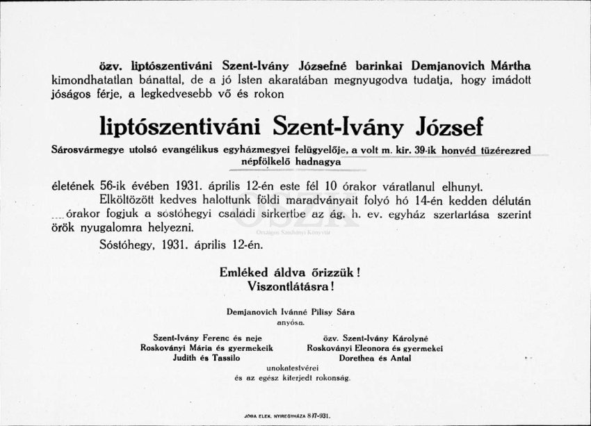 A gyászoló család a következő jelentést adta ki: özv. liptószentiváni Szent-Ivány Józsefné barinkai Demjanovich Mártha kimondhatatlan bánattal, de a jó Isten akaratában megnyugodva tudatja, hogy imádott jóságos férje, a legkedvesebb vő és rokon liptószentiváni Szent-Ivány József Sárosvármegye utolsó evangélikus egyházmegyei felügyelője, a volt m. kir. 39-ik honvéd tüzérezred népfölkelő hadnagya életének 56-ik évében 1931. április 12-én este fél 10 órakor váratlanul elhunyt.