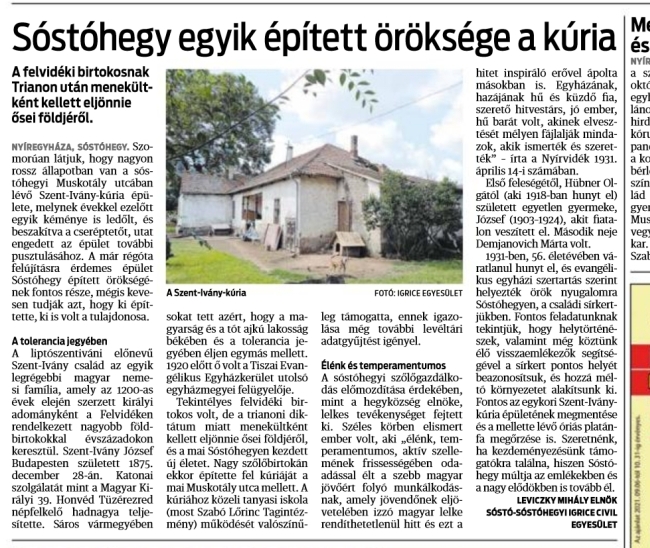 A jobb sorsra érdemes épület megmentése érdekében 2021. októberében egyesületünk figyelem-felhívó újságcikket jelentetett meg a Kelet-Magyarország vármegyei napilapban. A cikk megjelenése után az önkormányzat vizsgálatot végzett a témakörben, de érdemi előrelépést azóta sem tapasztaltunk.