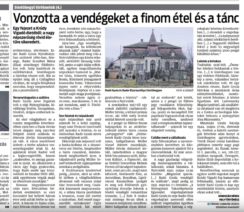 — "A Sóstó reneszánsza. A Sóstón uj élet indult meg. A közönség tegnap sűrű rajokban szállt ki a villamosokból és ellepte az erdő gondosan felépített uj utait. A sétálókon felállított uj padok kellemes hívogatók. A vendéglő uj színben pompázik. Az éttermet Radó Gyula ízlése festette ki gyönyörűen. Radó vendéglős a szálloda és étterem berendezkedését teljesen uj alapokra fektette, ugy, hogy a közönség az első percben észrevette, hogy a Sóstón feltűnően olcsót és jót kap. Radó már most egész sor banketre kapott megbízást.