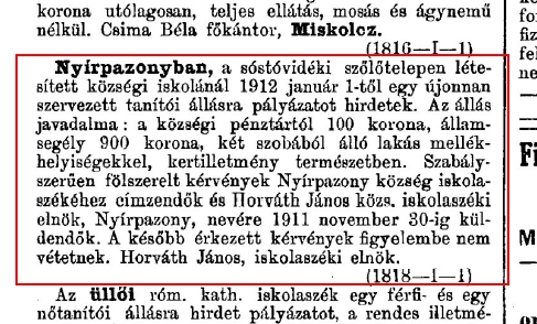 Abban az időben Sóstóhegy, akkori nevén Sóstó-Szőlőhegy közigazgatásilag Nyírpazonyhoz tartozott. A két hirdetés tartalma alapján joggal adódik az a következtetésünk, hogy az iskola 1912. januárjában kezdhette el a tényleges működését.