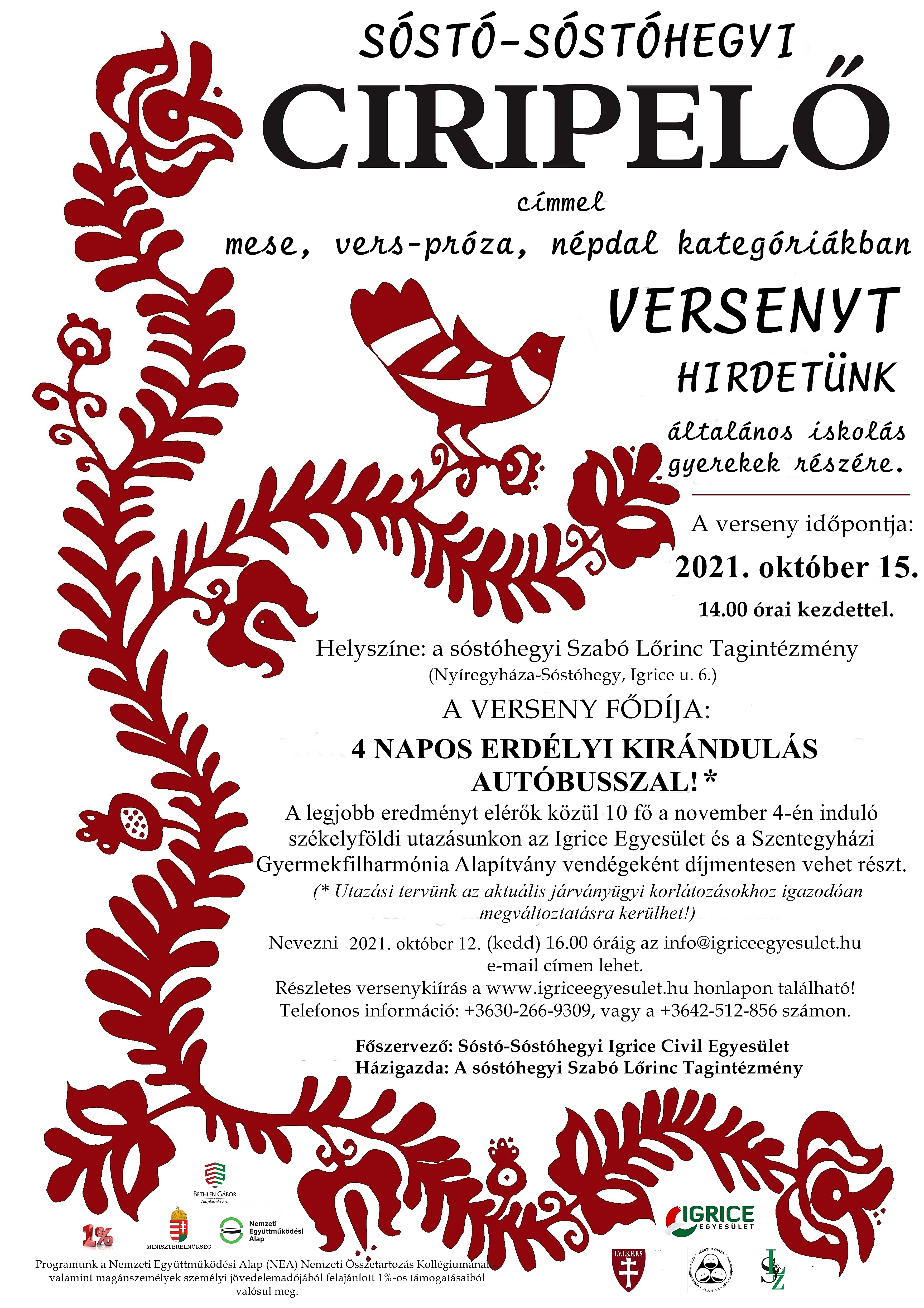 Ebben az esztendőben is a sóstóhegyi iskolával közösen rendezzük a „Sóstó-Sóstóhegyi Ciripelő” versenyünket mesemondó, vers-próza, valamint népdal kategóriákban. Versenyünkre a helyi gyerekeken kívűl távolabbról (határon innen, és túlról) érkezők jelentkezését is várjuk!