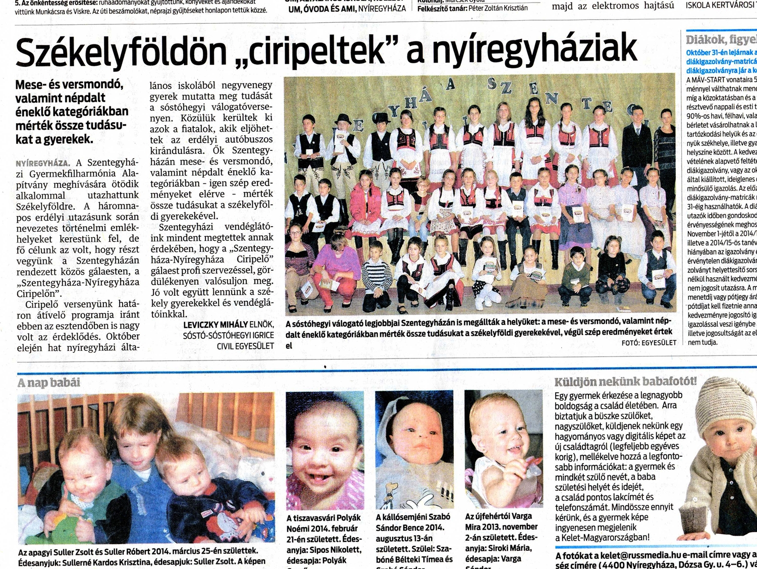 Ciripelő versenyünk határon átívelő programjára ebben az esztendőben is nagy volt az érdeklődés. Október elején hat nyíregyházi általános iskolából 41 gyerek mérhette össze tudását a sóstóhegyi válogató versenyünkön. Közülük kerültek kiválasztásra azok a fiatalok, akik erdélyi autóbuszos kirándulásunkra vendégként jöhettek el, és Szentegyházán mese és versmondó, valamint népdalt éneklő kategóriákban szép eredményeket elérve mérhették össze tudásukat a székelyföldi gyerekekével.