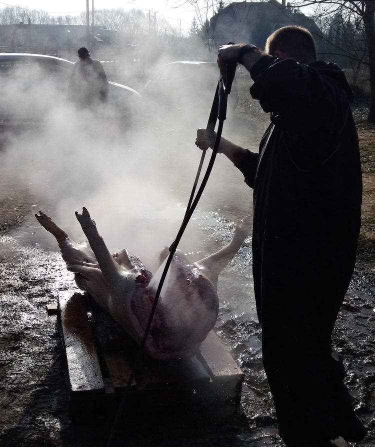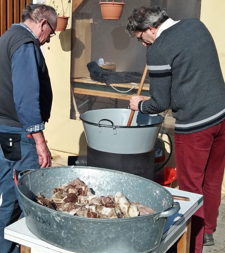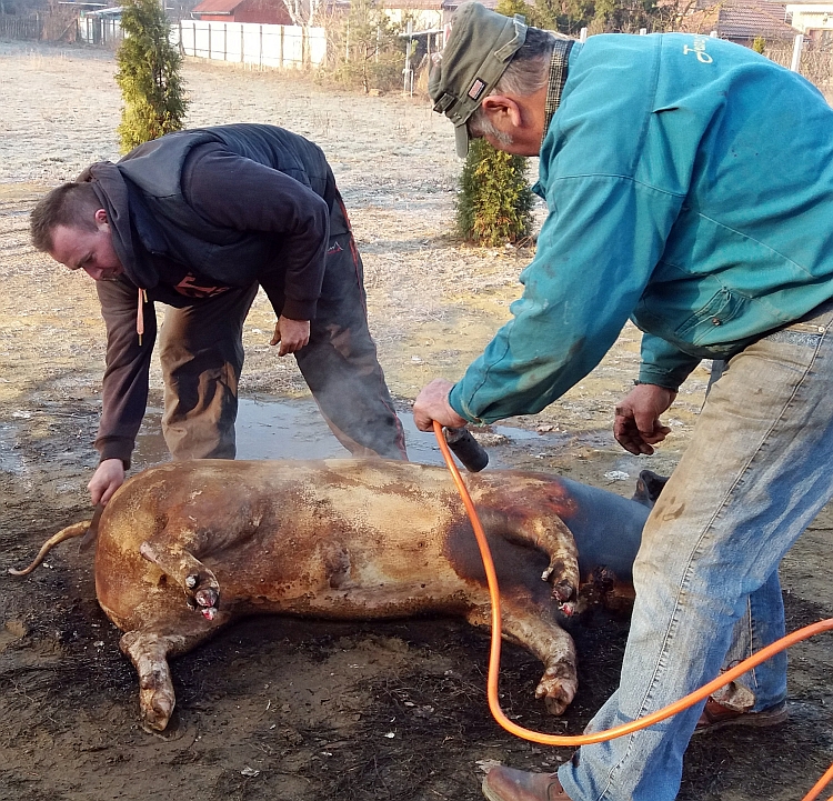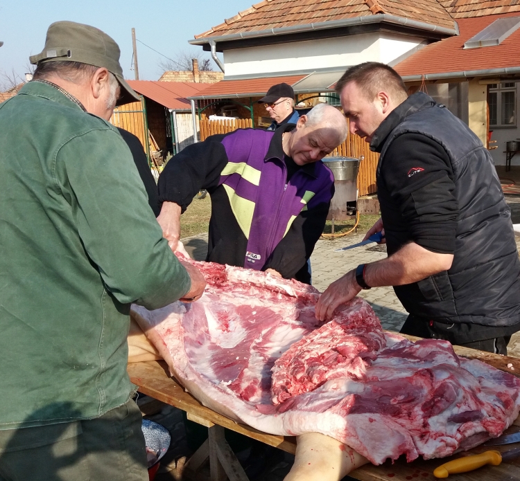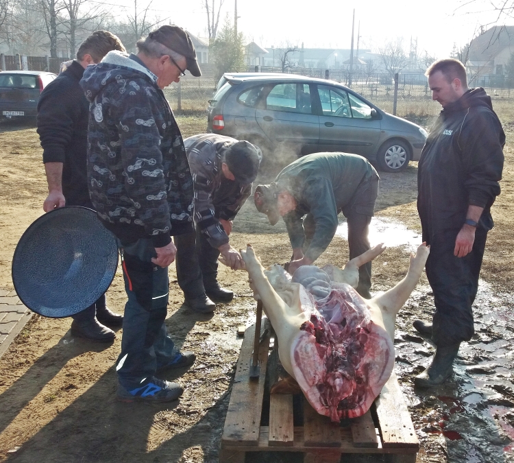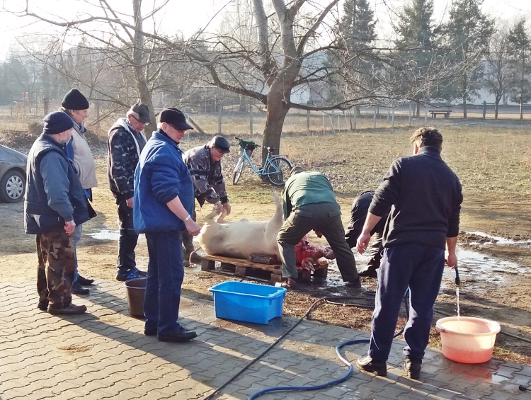 Idei hagyományos disznótoros napunk időpontjának kiválasztásánál nagy segítséget kaptunk az „időjárás felelőstől”, mert igazi napsütéses tavaszváró napon kísérhettük utolsó útjára a közel kétszáz kilós „malackánkat” a hurka-kolbász, disznósajt és tepertő készítésen át egészen az ünnepi vacsoraestünk végeztéig. (Igaz, tovább is, mert a másnapi takarítási "utóvédharcokról" sem kell ilyenkor elfelejtkeznünk!)