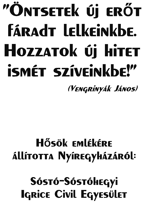 Külön mondunk köszönetet Vengrinyák János egyesületi tagtársunknak, aki erre az alkalomra egy nagyon szép verset írt. Ennek utolsó versszakát vésettük a Nyergestetőn állított kopjafánkba: