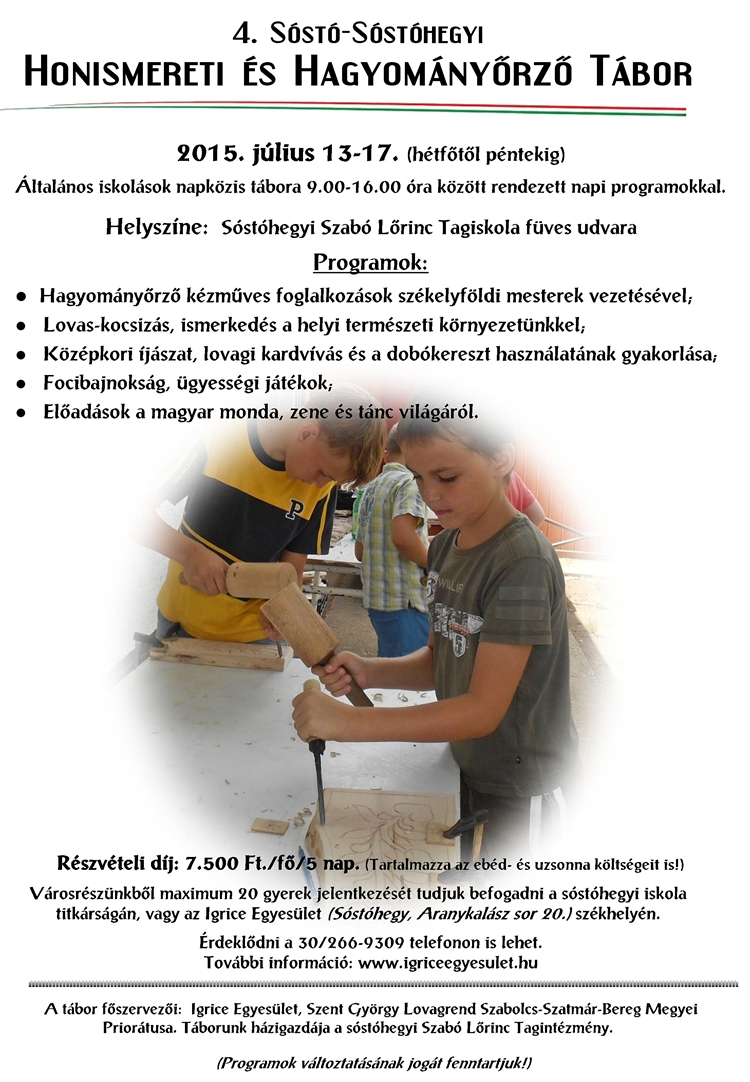 2015. július 13-17. között a Szent György Lovagrend Szabolcs Szatmár Bereg Megyei Priorátusával és a sóstóhegyi Szabó Lőrinc Tagintézménnyel közösen negyedik alkalommal szervezzük nyári táborunkat Sóstó-Sóstóhegyi Honismereti és Hagyományőrző Tábor elnevezéssel. Tartalmas kikapcsolódást ígérő programjainkra általános iskolás korosztályú fiatalok jelentkezését várjuk!