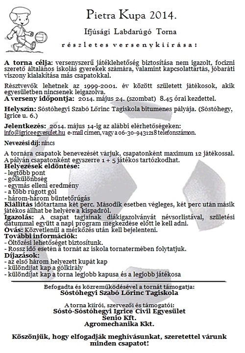 Az Ifjúsági Labdarúgó Torna megtartását az induló csapatokkal való előzetes egyeztetés után egy héttel későbbi időpontra változtattuk. Az új időpont: 2014. május 24. (szombat) 8.45 óra.