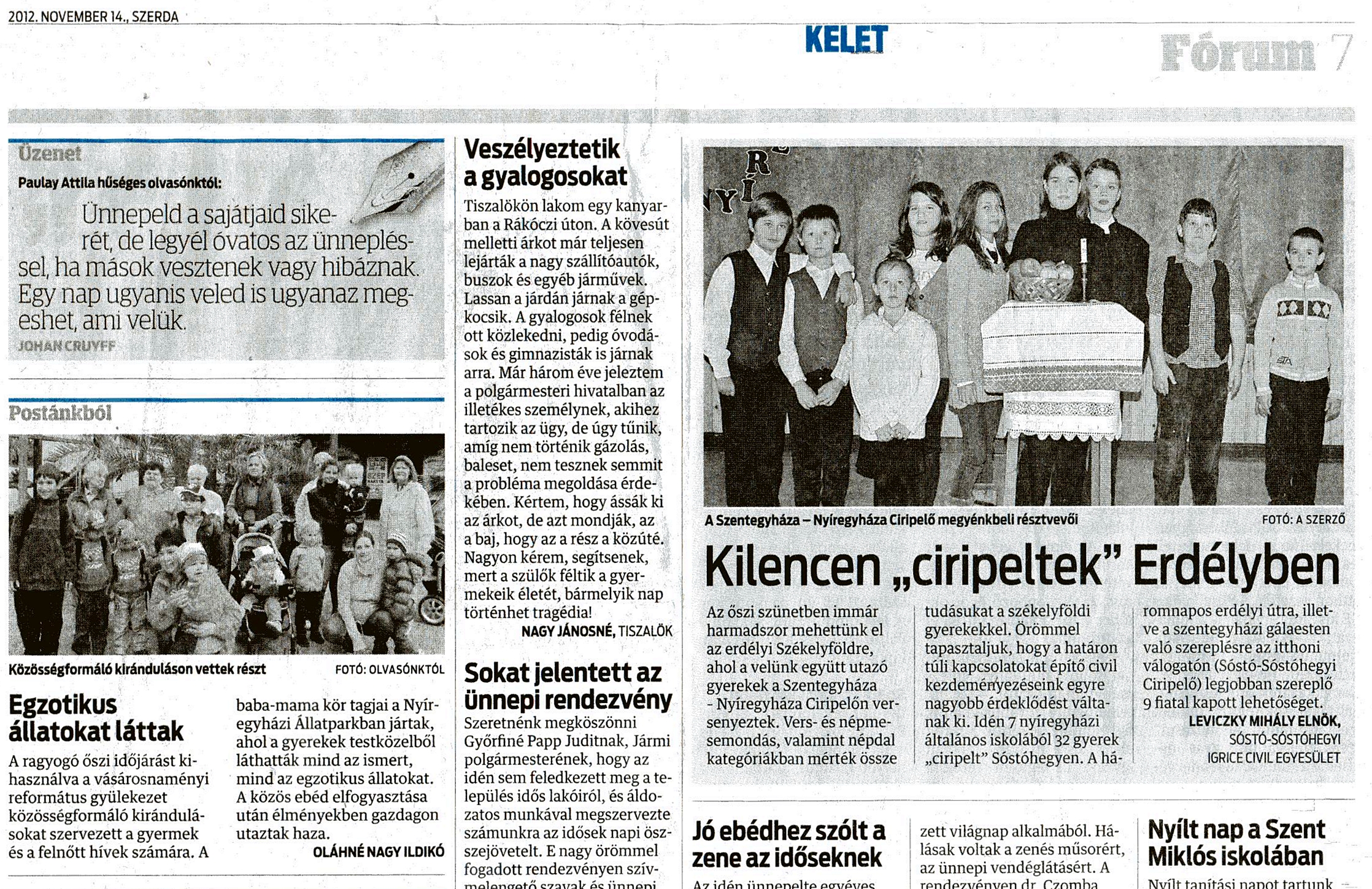 2012. év őszi iskolai szünetében ismét elmehettünk az erdélyi Székelyföldre, ahol a velünk utazó gyerekekkel a "Szentegyházi Gyermekfilharmónia Alapítvány" szervezte „Szentegyháza-Nyíregyháza Ciripelőn” versenyezhettünk. Vers- és népmesemondás-, valamint népdal kategóriákban mérhettük össze tudásunkat a székelyföldi gyerekekével.