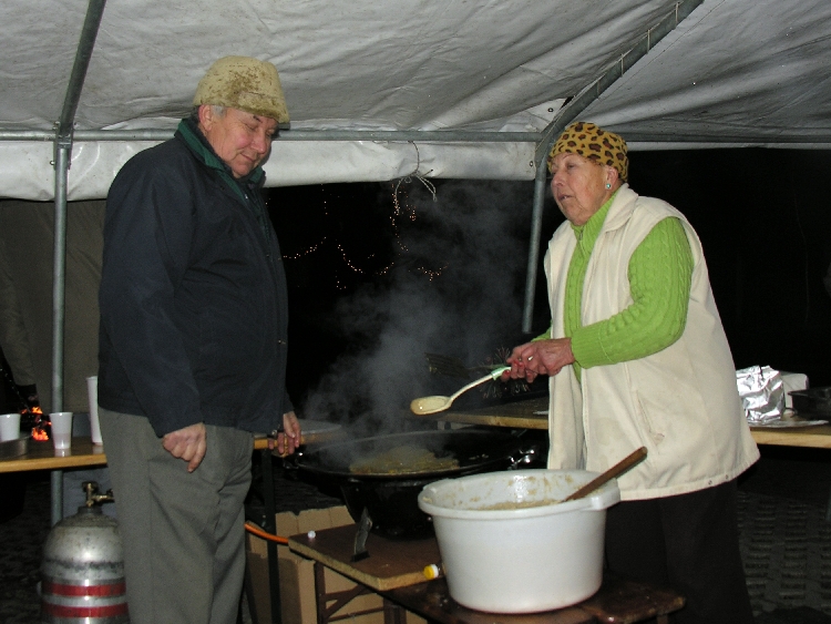 A szabadtéri tűzön ropogósra sült malacból jóval éjfél előtt már kóstolót is kaphattunk. Voltak, akik süteményekkel-, lapcsánkasütéssel- és jófajta forralt borral járultak hozzá közös ünneplésünk sikeréhez.